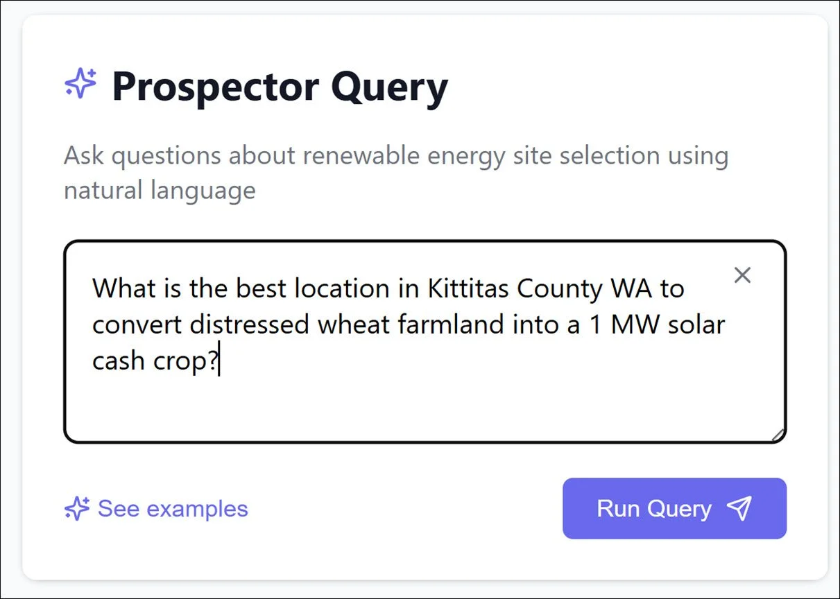 Got a question about solar sites? Just ask. Kelp’s Prospector service works like ChatGPT for solar development—turning your questions into detailed technical analysis, ranked opportunities, and actionable insights. No more digging for information. Just ask and get the info you’re looking for.